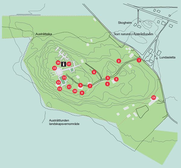 Innenfor porten ligger Lundahaugen, som inneholder mange minner fra den tyske okkupasjonstiden, og Forsvarets etterbruk. Haugen ligger i direkte tilknytning til Austråttlunden landskapsvernområde. Austråttlunden har et rikt plante-, fugle- og dyreliv, og er et populært turområde. Den gamle smijernsporten som ble laget av krigsfanger under andre verdenskrig er nå utstilt i museet Fosen Krigshistoriske Samlinger. Veien opp til toppen er spesielt godt fundamentert, for den skulle tåle transport av kanondeler på opp mot 100 tonn. Når du ferdes i lunden, vis hensyn til naturen og sauene som beiter der.