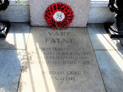 Nordahl Grieg forsøkte å melde seg til tjeneste hos militæret i Oslo og på Hønefoss, uten å lykkes. Han dro så oppover i Gudbrandsdalen igjen, der han meldte seg for lensmannen på Ringebu. Etter noen dager ble han med i ei gruppe på tredve mann som skulle bevokte gullbeholdninga til Norges Bank mens den ble ført til Tromsø. Han var med transporten over til Storbritannia, og skildra dette i reportasjesamlinga Flagget. Underveis fikk han i Tromsø noen dagers permisjon for å skrive et dikt til 17. mai. Med «17. mai 1940» ble Nordahl Grieg brått til en av våre fremste krigsdiktere. Han åpner med et av våre fremste nasjonale symboler: «I dag står flaggstangen naken / blant Eidsvolls grønnende trær». Diktet viser en forståelse for det som skal komme, den lange motstandskampen under fremmed åk.