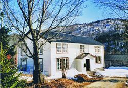 Stogebygningen vart oppført i tømmer for Tarjei Pålsson i 1950. Vel så 10 år seinare fekk utvendes paneling. Foto: Aanund Olsnes (2003)
