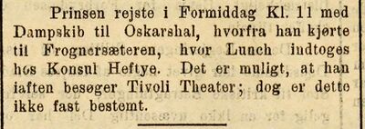 Faksimile fra Dagbladet 12. september 1885; notis om besøket fra Edward, prinsen av Wales (den senere kong Edward VII) i Kristiania, som inkluderte lunsj hos konsul Heftye på Frognerseteren.