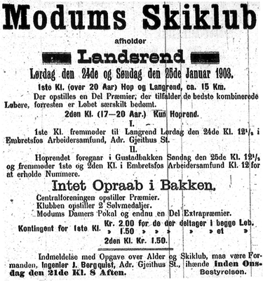 En av de største idrettsbegivenheter på Modum gjennom tidene er Hovedlandsrennet som ble arrangert av Modum skiklub den 18., 20. og 21. februar 1915. Da var H. M. Kong Haakon til stede.