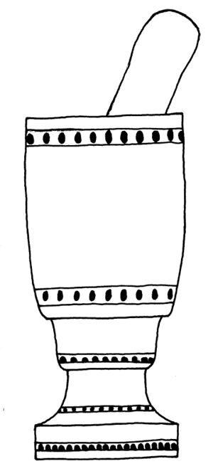 Morter med støter, sylinderformet kar, tradisjonelt av hardt tre, senere av messing, til å ­knuse f.eks. krydder i.