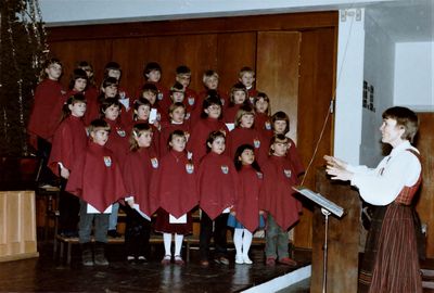 Rikard Kaarbø - byens grunnlegger. Leif Bothner - legendarisk ordfører. Magnar Hellebust - rådmann og samfunnsbygger. Sigurd Simensen - rådskommunist, organisasjonsleder, ordfører, lokalhistoriker og folketaler. Asbjørn Eidnes - en høvding innen byens kulturliv. Torny Nikolaisen - mangeårig biblioteksjef og kulturarbeider. Dagmar Andreassen - en pioner innen kvinnepolitikken. Paal Frisvold - generalløynant, en av foregangsmennene for Milorg. Leif Arne Heløe - ordfører, kulturarbeider og statsråd. De yngste koristene i Harstad, Minores, dirigert av Vigdis Ahlstrøm Svanæs julaften 1984 i Harstad kirke. Foto: Gunnar E. Kristiansen |