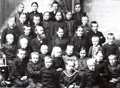 Stefan Frich med ei av skuleklassene sine. Tidspunkt og fotograf ukjent.