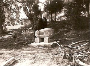 | Nils arbeidde på plassen Satabakke som høyrde til prestegarden. To jenter gjette buskapen på same plassen. Det var Gunhild Flatin og Barbro Satabakke. Dei såg at Sterke-Nils lyfte steinen opp i fanget og snudde seg rundt med han før han la han frå seg. | ||
