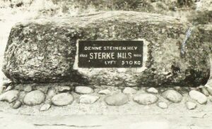 | Nils vart soldat i 1752 og ekserte paa Dalen. Det var just i den tidi, dei bygde festningen i Stavern og det var Nils med paa. Ein dag streva seks mann med ein svær granitstein, som skulde upp paa muren, men dei vann ikkje aa rugga honom eingong. Nils kom no til. Han had kararne gaa undan og tok sjølv fat i steinen. Han søkk i jordi til oklet, men steinen greidde han og det fint og. Men daa kommandanten fekk høyra um dette kars-taket, sagde han, at steinen skulde staa til et minne um dette inne ved festningsporten. Og der stend han den dag. | ||