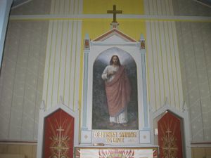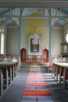 Noko tidlegare var det store rosevindauget over inngangsdøra fjerna. Det var i sers dårleg forfatning. I seinare tid er ei praktfull og sermerkt prismelysekrone restaurera og hengt opp att i midtgangen.