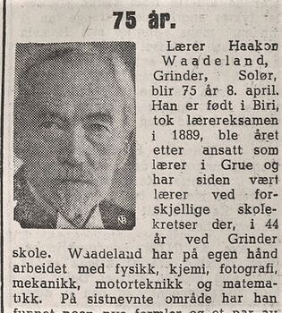 Faksimile fra avisa Vestopland 7. april 1945; omtale av Haakon Waaadeland i anledning hans 75-årsdag.