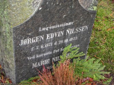 Jørgen Edvin Nilssen er gravlagt på Vestre gravlund i Oslo sammen med kona Marie. Tittelen Lægemissionær er benyttet på gravminnet, som dessuten har påskriften Ved korsets fot hos Jesus.