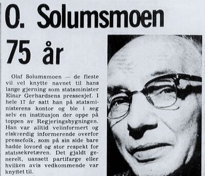 | Solumsmoen fratrådte som statsministerens statssekretær da regjeringen Gerhardsen gikk av i 1965, etter nesten 20 år som bindeledd mellom regjering og presse. Han bidro selv i høy grad til at begge parter og politikere i almindelighet fikk forståelse for betydningen av denne funksjon. Solumsmoen høstet da også usedvanlig mange lovord for sin innsats i regjeringsbygningen, selv om hans stilling ikke alltid var like lett i et stadig mer ustadig politisk klima. Allikevel nød han tillit og respekt i alle leire, både i dette og andre ombud. | ||