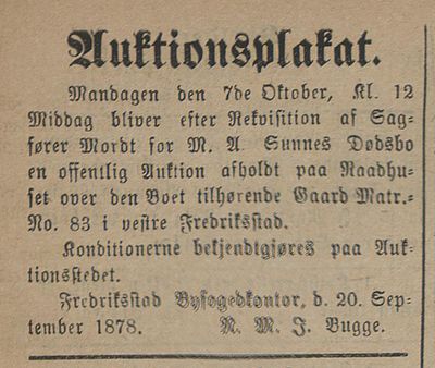 - Fredriksstad Tilskuer: «Auktionsplakat», side 2, spalte 1, 28. september 1878 (nb.no)