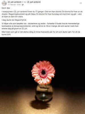 - ↑ 22. juli-senterets bursdagsblomst til Jon Vegard Lervåg 17. februar 2023.