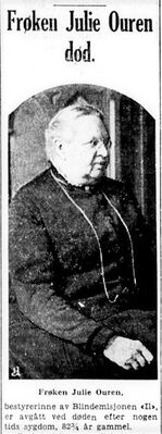 | Frøken Julie Ouren, bestyrerinne av Blindemisjonen «IL», er avgått ved døden efter nogen tids sygdom, 82 ¾ år gammel. En betydelig personlighet er dermed vandret bort, og de blinde kvinner i vårt land har mistet en av sine beste støtter. Frk. Ouren var utgått fra et velhavende hjem, men hennes interesse gikk allerede fra hennes ungdom i religiøs retning. Dr. Heimbeck satte henne da på den tanke å trykke bibelen for de blinde, og den grep hun ... Hun optok også arbeidet for å lære voksne blinde kvinner et håndverk ... For sitt uopslitelige arbeide for de blinde har hun mottatt St. Olavs orden og fortjenstmedaljen i gull. | ||