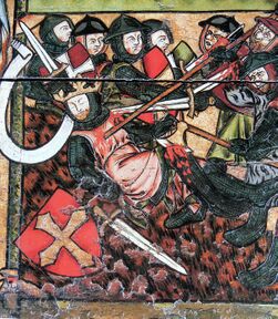 Her ser vi et maleri av Selshevneren mens den tar livet av Olav Haraldsson som her blir til martyren Olav den Hellige.