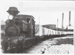 Etter en tid med tørking ble tømmeret lastet på jernbanen og transportert inn til fabrikkene for å bli bearbeidet til cellulose eller papir, se bildet. Når produksjonen hadde kommet så langt, trakk togene produktene til lagerhusene i Melløs havn for lagring før utskiping. Togene med ferdigprodukter kunne være lange togsett, som bildet viser. Det hendte også at varene ble lastet direkte fra tog og over til skipenes luker eller sendt med bedriftsbanen til Sarpsborg stasjon.