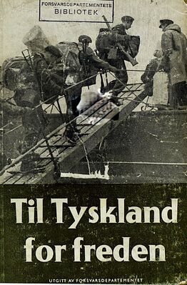 Faksimile av forsiden av boken Til Tyskland for freden, utgitt av Forsvarsdepartementet i 1947 for utdeling til alle soldatene i brigaden. Den inneholder artikler om bakgrunnen for oppdraget, historikk, folkerett, språk, hygiene, medisinske forhold og ellers gode råd.