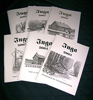 Det første nummeret av årsskriftet ble klart til bygdedagen 1985, og det var enighet om at det skulle oppkalles etter Inga fra Varteig. Dermed ble Inga årsskriftets navn. Fra første nummer har Anne Sofie Bergerud stått for illustrasjoner, og mange steder og bygninger har fått liv takket være hennes tegninger. I heftene finnes i tillegg til flere folketellinger og gårdsartikler som utfyller Olaf Spydevolds bygdebok fra 1956, også biografier og andre artikler. En del eldre numre er lagt ut på historielagets nettsider som pdf.