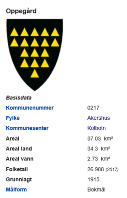 Oppegård kommune basisfakta per 2017, med kommunevåpenet.