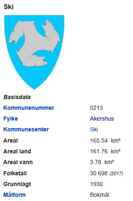 Ski kommune basisfakta per 2017, med kommunevåpenet.