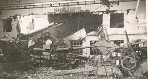 Bildet til venstre viser en samling av skadede flymotorer etter bombingen.