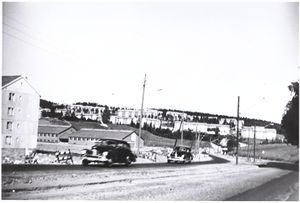 Trondheimsveien ved Bjerke. Utvidelse av veien på tidlig 1950-tall. I bakgrunnen Tonsenhagen. (Finn Arnesen)