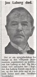 Faksimile fra avisa Sogn og Fjordane 15. juni 1948; utsnitt av omtale av Jon Laberg ved hans bortgang.