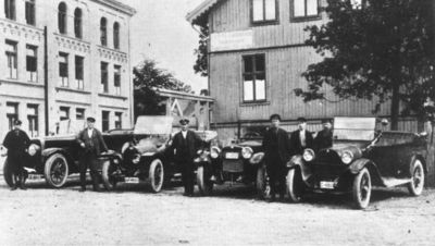 Drosjeholdeplassen i Sandvika - på hjørnet av det som i dag heter Kinoveien og Gågaten, fotografert i 1920. I bakgrunnen middelskolen - «Rønna» - som ble revet i 1962. Foto utlånt av Bærum bibliotek.
