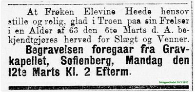 Elevine Heede døde 6/3 1883.[7] Ved dødsfallet noteres at hun er 71 år gammel, at hun døde 6. mars og at hun bodde i Schleppegrellsgade No. 14. Hun etterlot seg et testamente som var hos pastor Olsen i Grüners gate 8b. Testamentet var datert 30/6 1882. Det er skrevet inn i protokoll nr 20, folio 70. 13. mars 1883 overtar Marie Thorsen boet i tråd med testamentet.[8] Elevine Heedes død er også notert i protokollen til "Første Metodistkirke Oslo" (1865-1883) folio 226.[9] Her heter det at hun ble begravet 12. mars på Sofienberg kirkegård. Hun angis å være 63 år gammel og som oppholdssted ble først skrevet Arendal, men det ble strøket over og Kristiania ble notert. Hun døde av tæring.