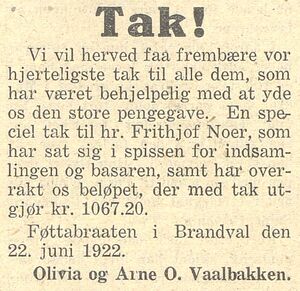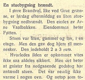 I slutten av mai 1922 kunne Glommendalens Social-Demokrat meddele at stuebygningen på Føttabråten var antent av et passerende tog, og var nedbrent. Det er vel å anta at huset ikke var forsikret, men bygdefolket trådte til. Indlandsposten bringer fire uker senere en takk fra ekteparet for et beløp på over 1000 kroner innsamlet ved en basar. Plassen ble ikke gjenreist, og Olivia døde i Kongsvinger i 1958, Arne i 1963.