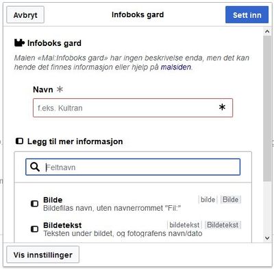 Samme framgangsmåte brukes også for andre infobokser. Dersom du går til en slik mal, og ikke finner koden du trenger, meld fra til en administrator, så blir det ordna.