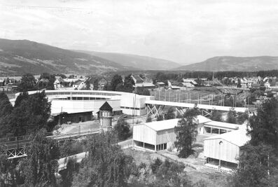 2. Oppland, Lillehammer-utstillingen 1937 med Cirkelplassen på Øvre Busmoen, bru over jernbanen mot Brubakken med utstillingsbygg for kunst og husflidshall og utstilling for jakt og fiske ved Brubakken -Maihaugen / DigitaltMuseum