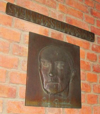 Nærbilde av portrettrelieffet av Svein Rosseland som pryder inngangen til huset som bærer hans navn på Blindern. Det er utført av nevøen Inggard Rosseland.