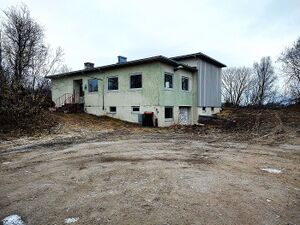 Marinefunkstelle Harstad som ble etablert i Kaarbøåsen av den tyske okkupasjonsmakten sommeren 1940, ble overtatt av Telegrafverket i september 1945. Bildet viser noe av det som ble stående etter at Harstad Radio flyttet til toppen av Harstadåsen i 1948. Vi ser den tyske senderbrakka med en garasje foran. Fotograf Steinar Pedersen står i 2. etasje i boligen som far Sigurd Pedersen oppførte og flyttet inn i høsten 1949. Foto fra 1965.