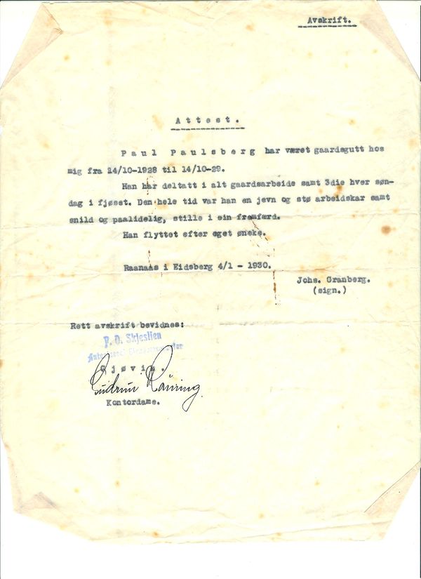 Paul Paulsbergs attester fra ulike gårds- og gartnerjobber på Østlandet 1928-1931, blant annet i Asker, Bærum og Eidsberg. Dette er jobber han hadde før han giftet seg og kjøpte bruket Paulsberg ved Gjøvik.