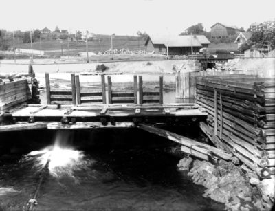 Vestfos Cellulosefabriks gamle nåledam i Vestfosselva. I bakgrunnen bedriftens sidespor og pakkhuset ved Vestfossen stasjon.