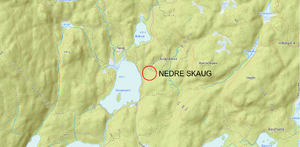| Nedre Skaug. I terrenget er det tydelige rester etter en grunnmur. Nærmest i bildet avtegner det nordøstre hjørnet seg som en forhøyning i bakken. Huset må ha vært stort. Fotografi fra 2018. | |