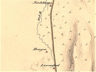 På kartet fra 1822 omtales plassen som Hougen der den ligger på vestsida av Holtbekken og Kongevegen. Plassen Rastahaugen (Søndre Rasta) omtales her som Nordshougen. Kartverkets historiske arkiv.