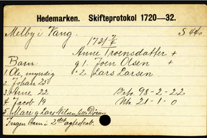 10 riksdaler i begravelses kostnader. Lars giftet seg annen gang med Anne Troensdatter, Enka etter Jon Olsen.