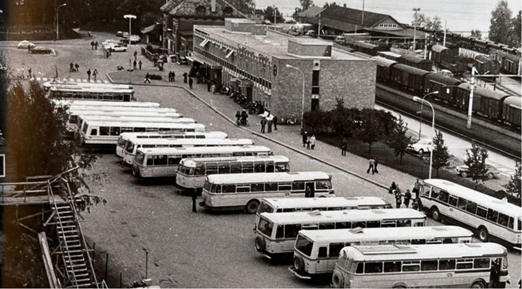 Busser på syttitallet ved Lillehammer busstasjon. Busser fra Gausdal Bilselskap (GB), Lillehammer-Ringsaker Bilruter (LRB), Torpa Bilruter, Ringebu Bilruter, Hamar og Omland Bilruter (HOB), Jotunheimen og Valdresruten Bilselskap (JVB)