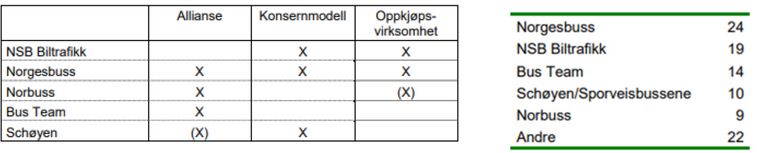 Oversikt over de seks konsernene som uitfører hoveddelen av det lokale rutetilbudet i Norge. I tillegg kommer enkelte av de opprinnelige selskapene Som står for 8 prosent av kollektivtilbudet: Firda Billag, Saltens Bilruter, Setesdal Bilruter og noen få mindre selskaper i Innlandet med rutekjøring under terskelverdiene for påbudt anbud.