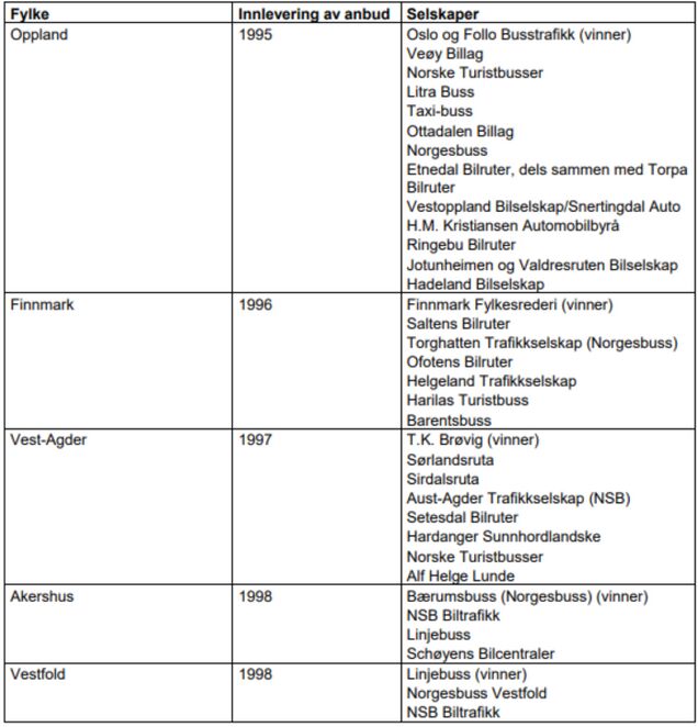 På det tidspunktet var det ikke introdusert anbud i fullt mon. Bare Oppland, Vest-Agder og Finnmark hadde begrensede anbud mellom 1995 og 2000.
