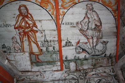 I skråtaket er ti figurar frå det gamle testamentet måla inn i bogeforma nisjar. I loftet over profetane svevar lubne englar i luftige gevantar. Kvar profet står fram med sine typiske attributtar, saman med namna deira. Taket under hanebjelkane er dekorert med blomar og englar. I halvveggen mot koret er St. Peter og St. Andreas framstilt ståande på kvar si side av kong Fredrik IV sitt monogram. På nordveggen finn me, rekna frå skipet, Amos, Sakarias, Malakias, Elesius og Jonas, på sørsida omfattar figurframstillinga Elias, Daniel, Esekiel, Jeremias og Samuel. Over dei bibelske figurane er det måla rankar i oransje og oker.