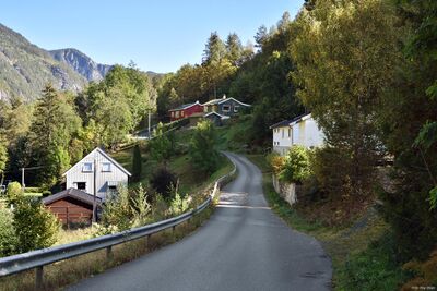 Vegen ligg på garden Åslands grunn. Busetnaden består av bustadhus sett opp på 1950-talet.