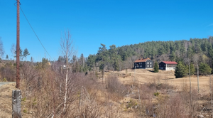 | Åsterud. Åsterud ligger til venstre i bildet, til høyre går veien innover mot Ertelia og nikkelverksgruvene. Utsnitt av fotografi fra 1956. | |