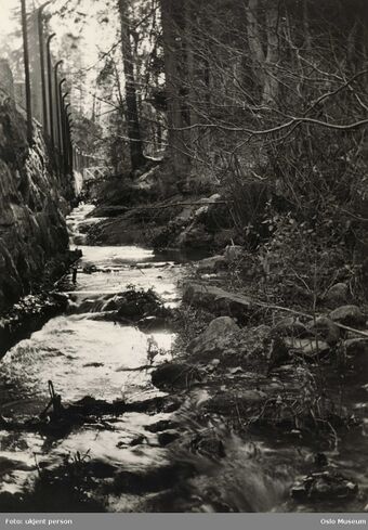 | Østensjøbekken ved Christinedal, i dag adresse Harry Fetts vei 10. Foto: Oslo Museum (1930-1940).
