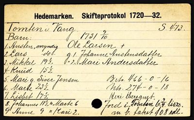 - ↑ Hedemarken sorenskriveri. Skifteprotokol 1739-43, s. 4097