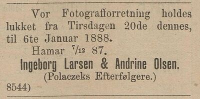 Andrine Olsen var sammen med Ingeborg Larsen ansatt hos Ovesen i Christiania i 10 år før hun 18. 6.1887 sammen med henne åpnet fotografisk forretning i Adam Felix Polaczeks forrige atelier på Hamar med firmanavnet «Larsen & Olsen». De måtte flytte fra atelieret i 1890 da huset ble solgt, og slo seg ned i Grønnegata 41.