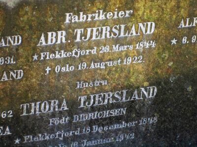 - Abraham B. Tjersland i folketelling 1865 for Flekkefjord prestegjeld, Flekkefjord kjøpstad fra Digitalarkivet.
