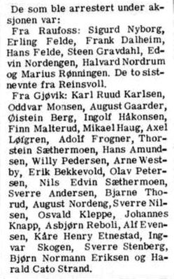 | «Det ville imidlertid være ulikt tyskerne å la en slik dramatisk episode stilne uten mottrekk. Mottrekket kom da også allerede dagen etter, med den såkalte "Aksjon Raufoss". Tyskerne gikk da til arrestasjon av 2 personer hjemmehørende på Reinsvoll, 6 fra Raufoss og 29 fra Gjøvik, i alt 37 personer.»[8] | ||