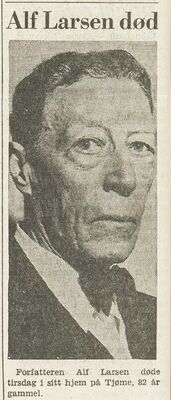 | Ved Alf Larsens bortgang er det nærliggende å si at en epoke er slutt: Den litterære gullalder i Norge. Som ung mann ble han stillet i klasse med Olaf Bull og Herman Wildenvey, og han var bare litt yngre enn Knut Hamsun. Han tilhørte samme generasjon som Sigrud Undset, Johan Falkberget og Olav Duun. Med dem hadde han ett felles: En absolutt målestokk for menneskeliv og diktning. ... Den yngre generasjonen kjenner vel kanskje polemikeren Alf Larsen best, men det hersker neppe tvil om at denne ener i vårt kulturliv har skrevet både dikt og prosa som vil bli stående lenge ved sin iboende kraft. | ||